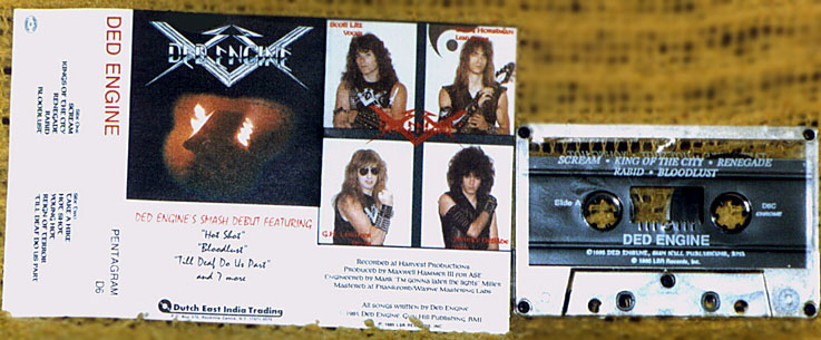 Self Titled Debut Album Released on Vinyl and Cassette in 1985. Overseas distributors referred to this album as having the title "Hot Shot", as it was common practice in the industry to name self-titled albums using the side 2 track 2 song. We officially recognize our album title as simply "Ded Engine".