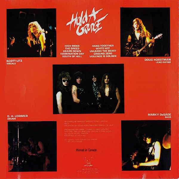 1987 saw the 2nd album titled "Hold a Grudge" released in LP, cassette, and CD form. It was released on Grudge Records, a company formed by former CBS Records employees. Originally distributed by Compass Distributing, we dropped them in favor of Important's wider international distribution. Songs were High Rider, The Breed, Heads Down, Termination Day, South of Hell (3rd version), Hang Together, White Hot, Unleash the Beast, Ground Zero, and Violence is Golden. Today I've seen the CD's sell on eBay averaging in excess of $30. Would you like a copy for yourself? Limited availability and other options by clicking here!